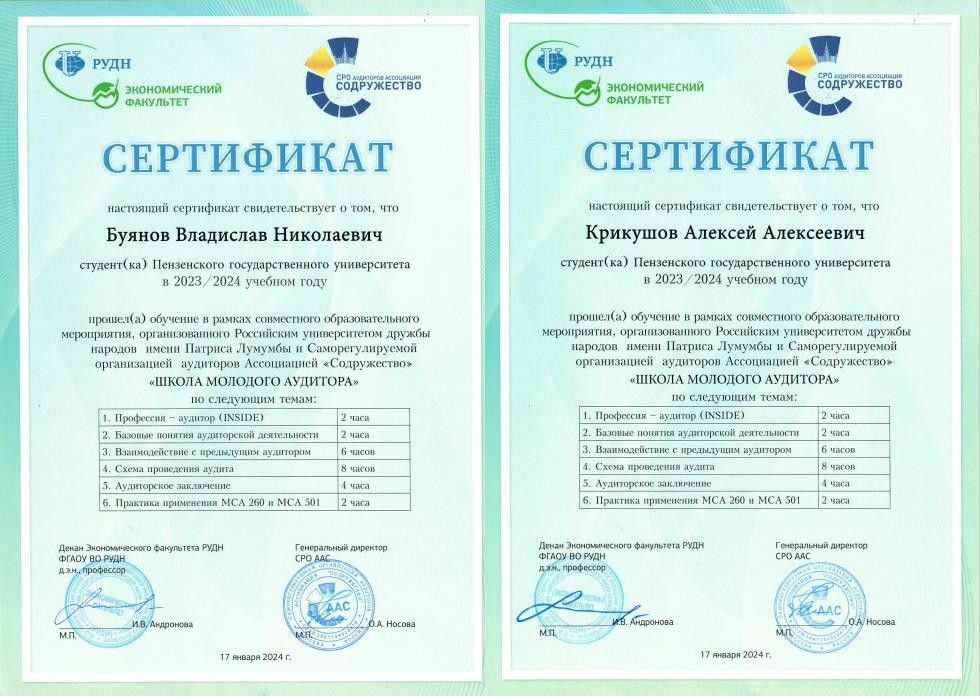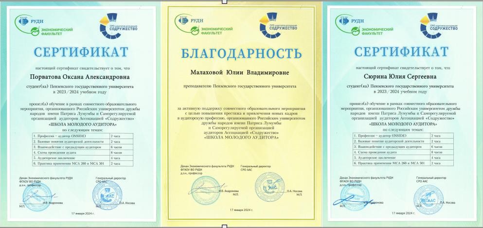 Студенты группы 20ЭЭу1: Анисина Ксения, Юнкина Алия, Крикушов Алексей, Буянов Владислав, Сюрина Юлия и Порватова Оскана прошли обучение в рамках совместного образовательного мероприятия «Школа молодого аудитора», организованного Российским университетом дружбы народов им. П. Лулумбы. Куратор мероприятия от Пензенского государственного университета — к.э.н., доцент кафедры «ЭиФ» Малахова Ю.В. По окончании обучения студенты получили сертификаты.