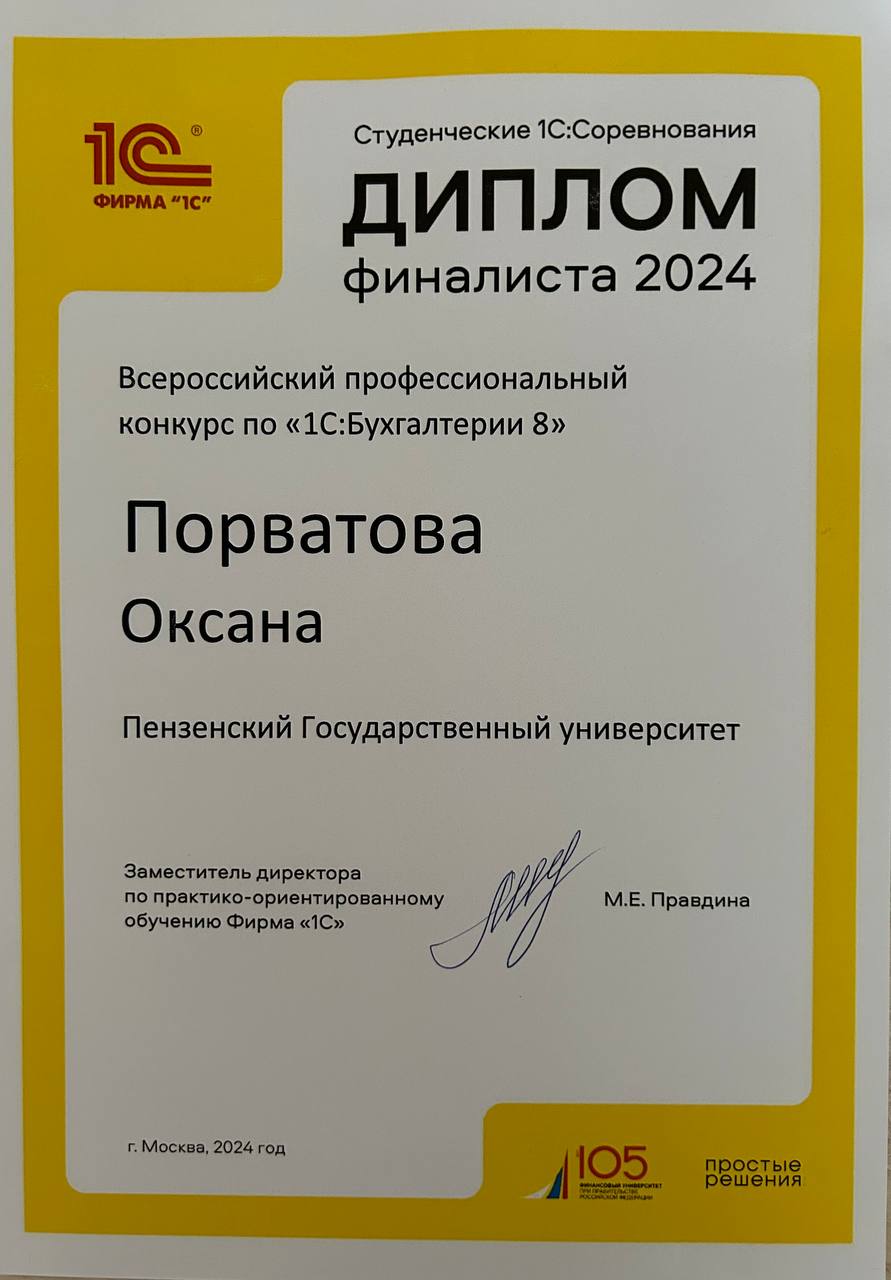 1 апреля 202 4 г. в Центре разработки и обучения 1С в г. Москва прошел XVIII Всероссийский профессиональный конкурс по «1С:Бухгалтерии 8». По итогам регионального тура в финале конкурса принимала участие студентка ИЭиУ Порватова Оксана, группа 20ЭЭу1. Результаты конкурса будут озвучены в конце мая.