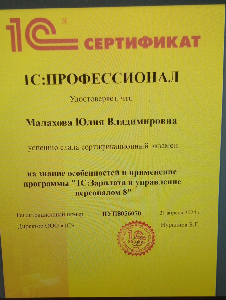 Доцент кафедры Малахова Ю.В. успешно сдала сертификационный экзамен на знание особенностей и применения программы «1С: Зарплата и управление персоналом 8».